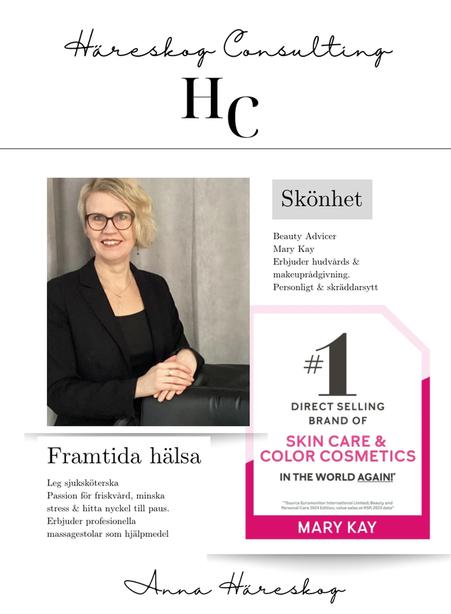 Anna är inte bara en expert på hälsa och friskvård – hon är också en passionerad Beauty Advisor med Mary Kay. Genom personlig hudvårds- och makeuprådgivning hjälper hon dig att hitta rätt produkter för din hudtyp och stil. Och det är ingen tillfällighet att Mary Kay precis har blivit utsedd till "Nr 1 Direct Selling Brand of Skincare and Cosmetics in the World" för andra året i rad!